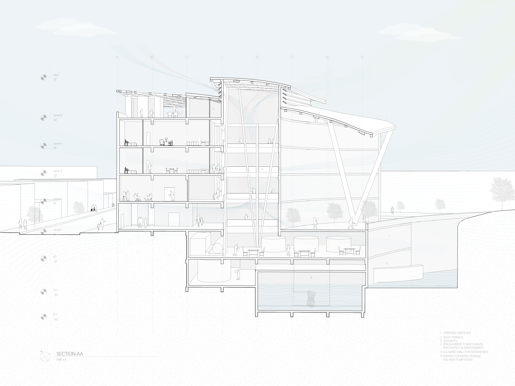 Organized around a central atrium, the building connects public and private spaces, linking hemp production, water management, retail, education, and residential programs. Shared circulation areas foster interaction and visibility of sustainable processes, while maintaining separation for private living. The design emphasizes seamless integration of work, learning, commerce, and community in a dynamic mixed-use environment.